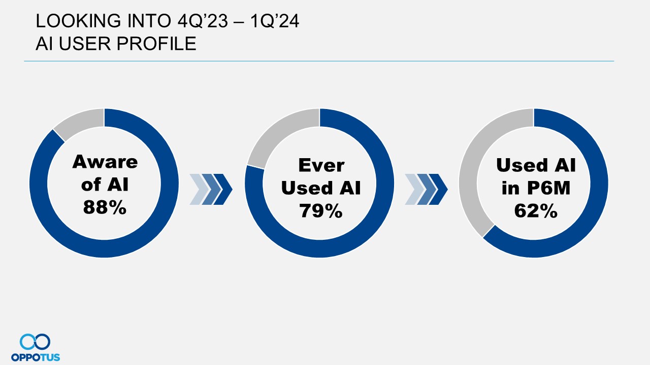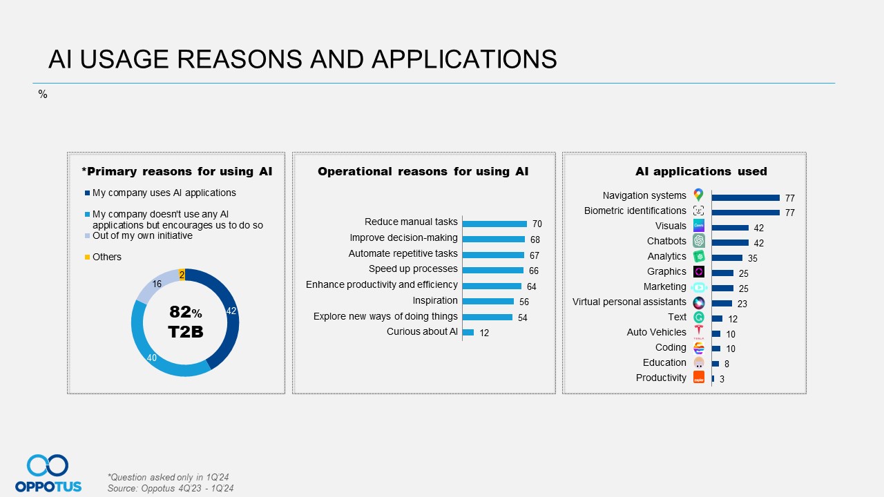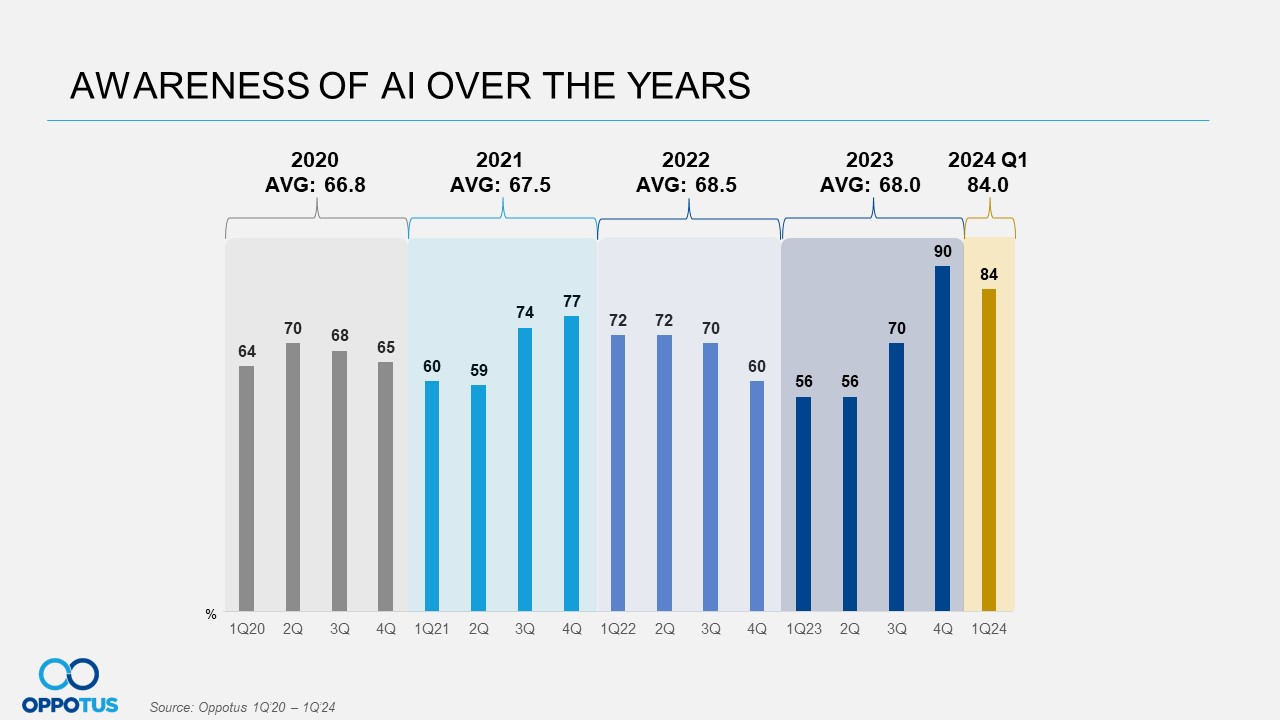 Looking at the awareness of AI among Malaysians, we see that it has generally been on the rise ever since 3Q’23, kicking off 2024 at an 84% rate of awareness among our respondents, which is in line with the growing usage and investment in AI globally.