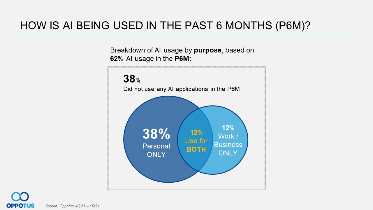We then look closer at how AI has been used in the past 6 months. Our survey found that the majority of AI usage was exclusively for personal purposes; with only 12% of AI users utilizing it for work/business or for the combined purposes of personal and work usage.