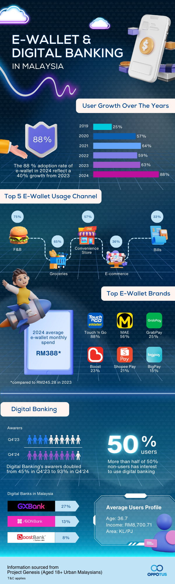 The infographic below will give you a better view of the e-wallet and digital bank scene in Malaysia, or you may hop into our full-length article here. If you would like to dig deeper into the data, feel free to contact us at theteam@oppotus.com!