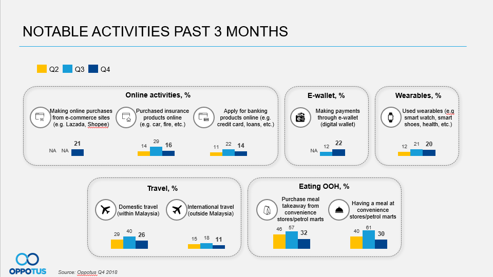 For tech trends, esports sees an increase in both awareness and familiarity between Q3 and Q4, while cryptocurrency ownership has dropped 7% in the same amount of time. Could this be a reflection of continued trends in Malaysia as we go into 2019?