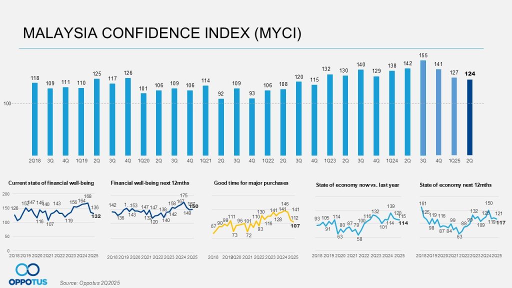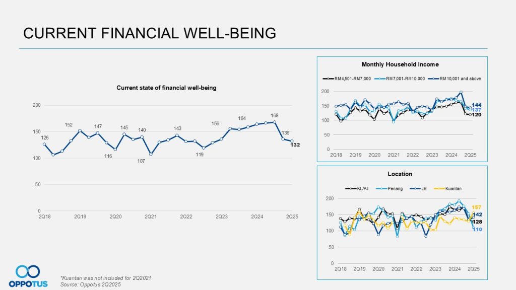 Moving into Q2 2025, Malaysian’s financial well-being declined further, falling to 132 points from 136 points in the previous quarter. This decrease suggests a ripple effect from the MYCI trend to the financial sector.