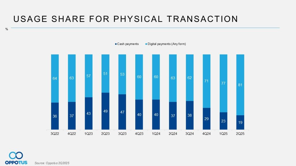 Digital payments have gained further momentum since Q3 2023, with this quarter marking an all-time high usage share for physical transactions at 81% (any digital form), while cash usage dropped to its lowest share at 19%.
