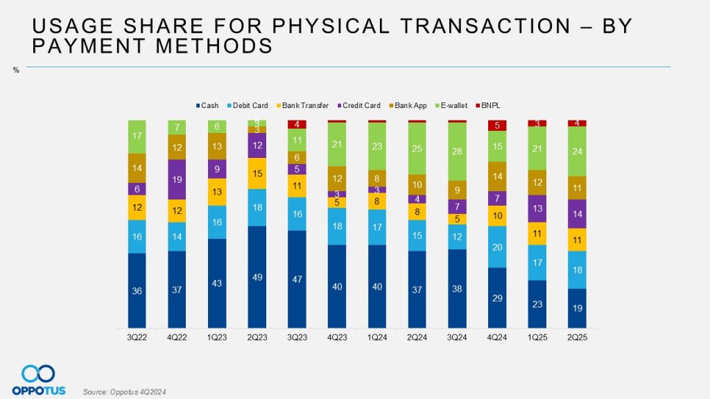 Within the digital payment usage share in physical transactions, e-wallets remained a favourite (24%), followed by debit cards (18%), and credit cards (14%). BNPL is a notable emerging method, gaining traction over the past three quarters. The attractiveness of BNPL promotions has drawn a growing number of consumers, as its coverage now spans beyond retail into areas such as online shopping and insurance.