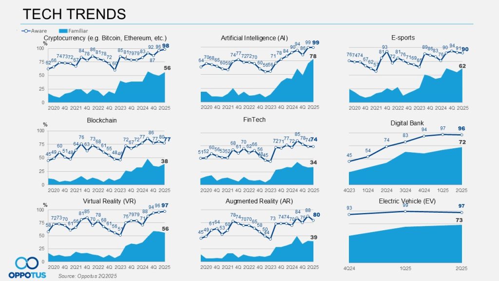 Coming to the Tech Trends category, Electric Vehicle (EV) is the latest addition to this study and has gained strong traction, fueled by robust government support and growing consumer acceptance of this new way of driving. Since Q4 2024, awareness has robustly remained above 90%, with familiarity consistently exceeding 50%. This enthusiasm is reflected in registration numbers: EVs recorded a substantial year-on-year (YoY) growth of 71.13% (June 2024 vs 2025), with total registrations in the first six months of 2025 reaching 17,143 units, compared with 10,633 units during the same period last year.