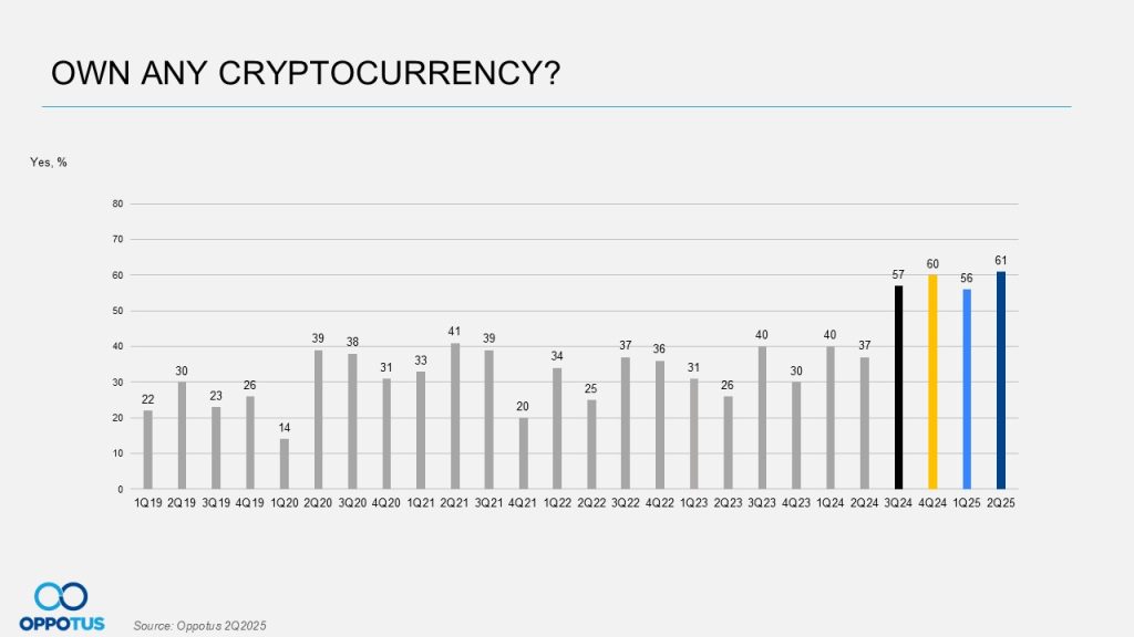 Moving on, cryptocurrency ownership trend also displayed a noticeable consolidation pattern since Q3 2024, averaging 58.8% ownership across these four quarters. This sustained adoption demonstrates that consumers are becoming not only more open to, but also increasingly confident in, cryptocurrency as an asset class— despite the high and low market fluctuations seen in Q2 2025.