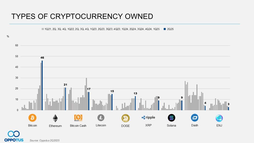Similar to the previous trend, Bitcoin continues as the top cryptocurrency owned in Malaysia (46%) in Q2, also an unprecedented figure was recorded. While Ethereum (21%) and Bitcoin Cash (17%) remain stable from the previous quarter, there is a notable improvement for Dogecoin, where its adoption rate increased to 13% (compared to 11% in the Q3 2024 to Q1 2025 average).