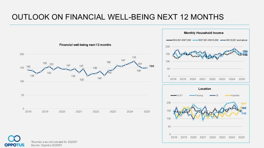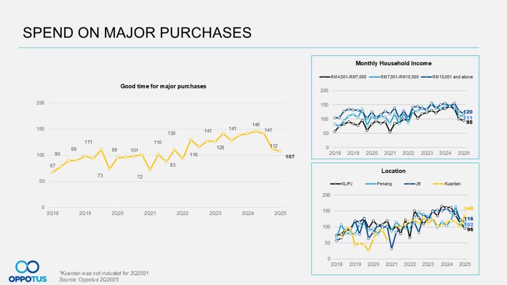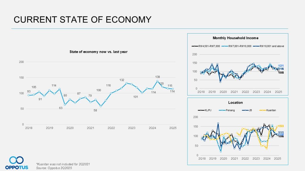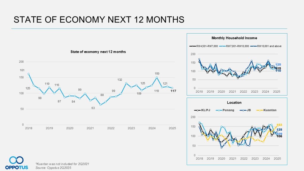 Likewise, consumer outlook on their financial well-being over the next 12 months remains flat at 150 points quarter-to-quarter. The three major factors mentioned earlier (global tariff, crude oil price spike, SST hikes) have significantly influenced most rakyat, contributing to this stagnation. This cautious sentiment is particularly evident across analyses of monthly household income levels and geographic locations, where the downtrend was also observed.